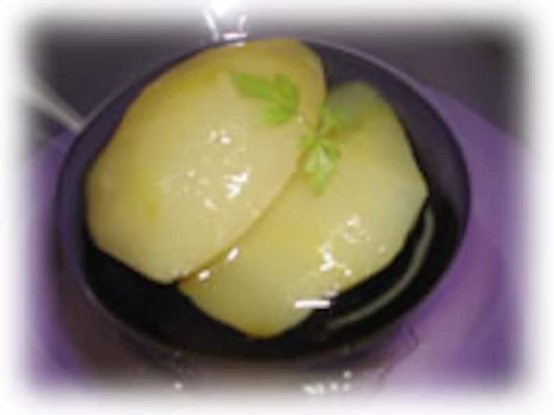 | 2・次に皮をむき芯を取り除いた洋梨を入れ、弱火で30分間静かに煮ます。 | 3・シロップに浸けたまま冷ましてから、冷蔵庫で保存します。 | |