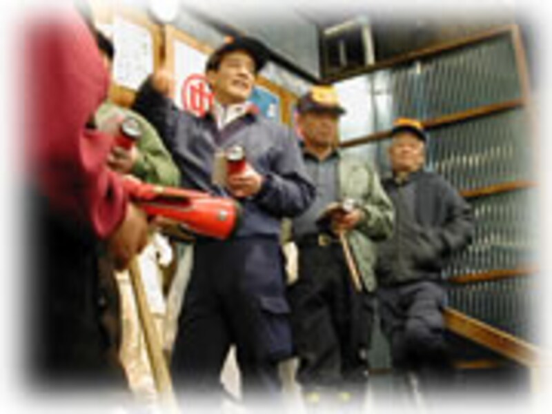 水産部では屋号が入った帽子をかぶった仲買人だけがセリに参加できます。彼等は一様に長靴をはき、ズボンのポケットにタオルねじ込んでいます。ちなみに青果部の仲買人の帽子には番号がつけられています。 | |