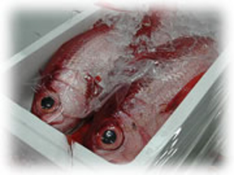 | 冬の鍋料理にかかせない魚「アンコウ」。大骨(背骨)を除きほとんど食べられます。あん肝はビタミンAが多く、ひれ、皮には、あのコラーゲンが多く含まれているそうですよ。 | 冬が旬のキンメダイは、肉質は白身で柔らかく、お刺し身や煮物に利用されます。約40cmもあります。 | |