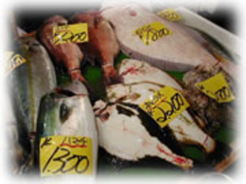 | セリ場の横が市場です。小売店や料理屋などプロの人たちが買い物をしていますが、一般の人でも買い物はできます。 | 目を見張るほど新鮮な魚が多く並べられています。魚図鑑で調べてみないと分からない名前の魚も色々あります。 | |