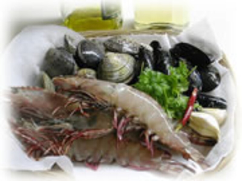 6・エビ、アサリ、ムール貝をとりだしてから、ザルでスープを濾しておきます。茹で上げたパスタにスープを絡めチーズも絡めてお皿に盛り、エビ、アサリ、ムール貝、イタリアンパセリを飾りつけます。上からスープをそ~っと回しかけます。 |