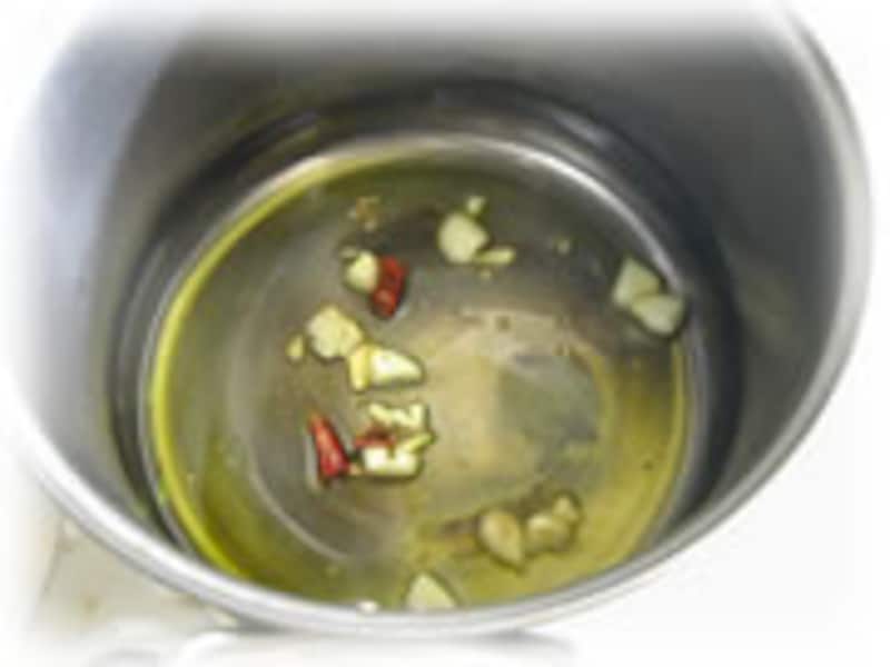 | 1・鍋にオリーブオイル、スライスしたニンニクを入れ弱火で炒めます。ニンニクが色づいてきたら、種を取った赤唐辛子を合わせて炒めます。 |
