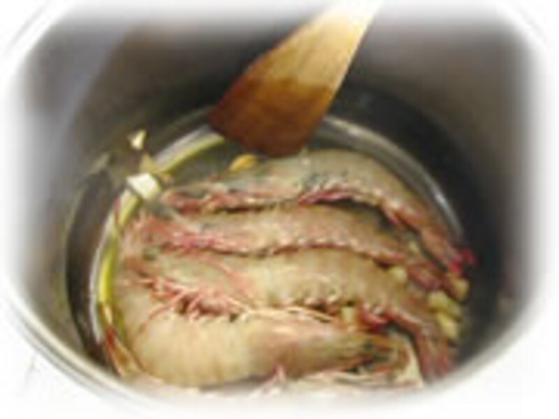 2・次に海老を加えて、中火で殻が白くなるまで約3分くらい炒めます。 |