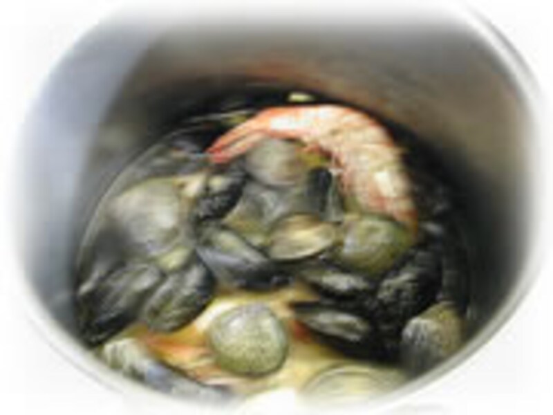 6・エビ、アサリ、ムール貝をとりだしてから、ザルでスープを濾しておきます。