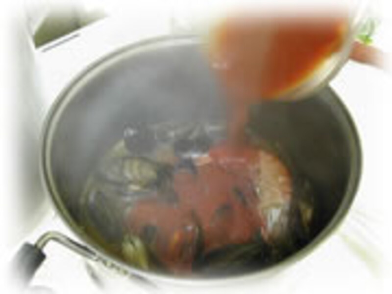 | 3・あさり、ムール貝、白ワインを加えます。 | 4・ホールトマトを加え、沸騰してきたらアクを取り除き、弱火で10分間煮込んで塩コショウで味をととのえます。 | |