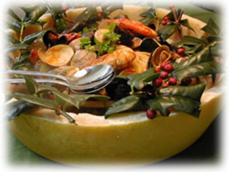 このチーズを削り取り、盛りつけのボウル代わりに使って魚介類のチーズパスタを楽しみました。チーズの熟成されたアミノ酸系の美味しさがたまりません。 |