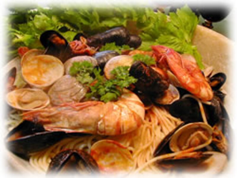 6・エビ、アサリ、ムール貝をとりだしてから、ザルでスープを濾しておきます。茹で上げたパスタにスープを絡めチーズも絡めてお皿に盛り、エビ、アサリ、ムール貝、イタリアンパセリを飾りつけます。上からスープをそ~っと回しかけます。 |