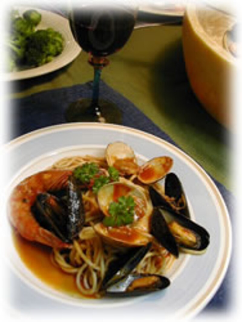 | 材料4人分:パスタ500g、有頭エビ4匹、アサリ20個、ムール貝20個、ホールトマト缶詰120g、白ワイン200cc、ニンニク2片、赤唐辛子1本、オリーブオイル50cc、塩コショウ少々、イタリアンパセリ。 | グラナパダーノは、パルメジャーノ・レジャーノの厳しい規格に合わないものをさすとも言いますが、実際は生産地が違うとても似通ったチーズのことを呼ぶそうです。 イタリアンの沈さんのガイド記事に、この違いが書かれています。 |