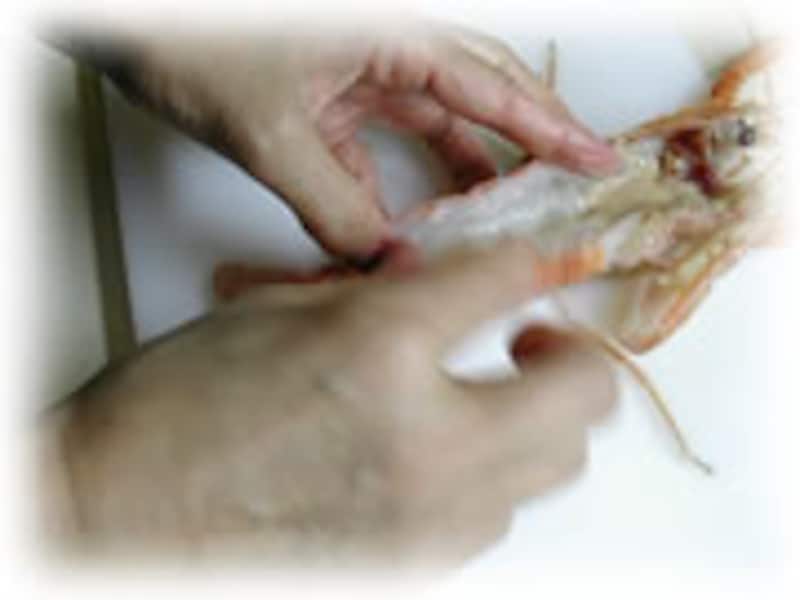 | 1・頭を左にして包丁を立てて、背開きにします。背わたを竹串で取り除きます。 | 2・次に頭を右にして包丁を立てて口先まで切り開きます。 | |