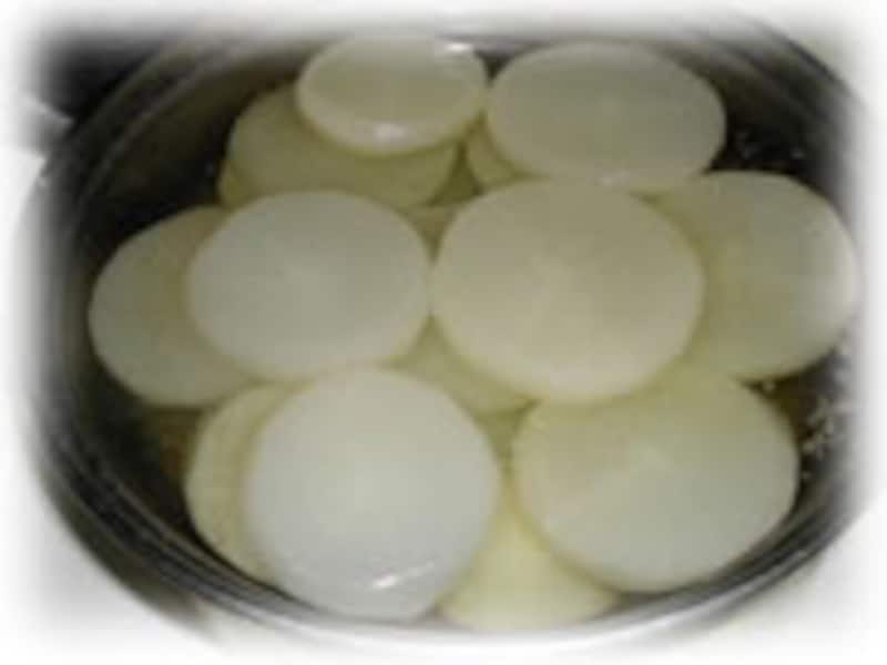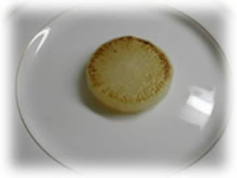 | 5・スカンピとは別にふろ吹き大根を作っておきます。大根を2cmの幅に切り、昆布ダシで柔らかくなるまで煮ます。 | フライパンにオリーブオイルを薄く引き、大根を入れ両面に焦げ目が付いたら、お皿にうつします。 | |