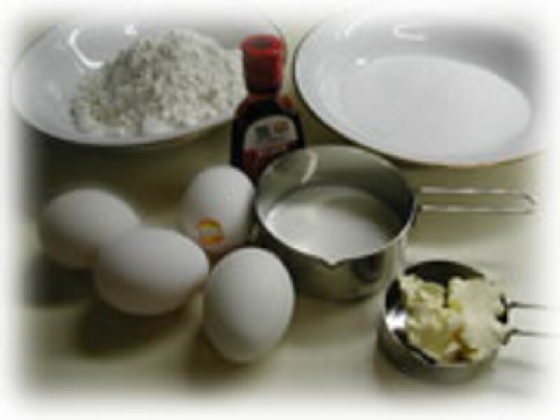 ★約25センチ角で、厚みが1センチ位のスポンジ生地材料:薄力粉120g(2回ほど振るっておきます)、グラニュー糖120g、全卵4個、バター25g、牛乳25cc、バニラエッセンス少々 |