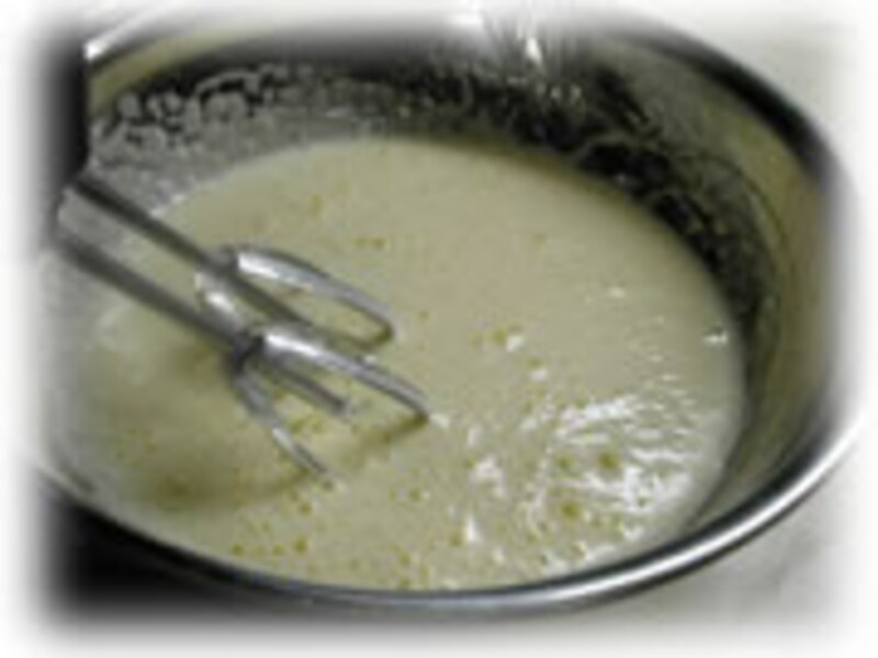 作り方1・ボールに全卵4個を割り入れ、軽く泡立てます。次に約30度のお湯で湯煎しながら、グラニュー糖を少しずつ加え、 白っぽくなるまでしっかりと泡立てます。最後にバニラエッセンスを少し加えます | |