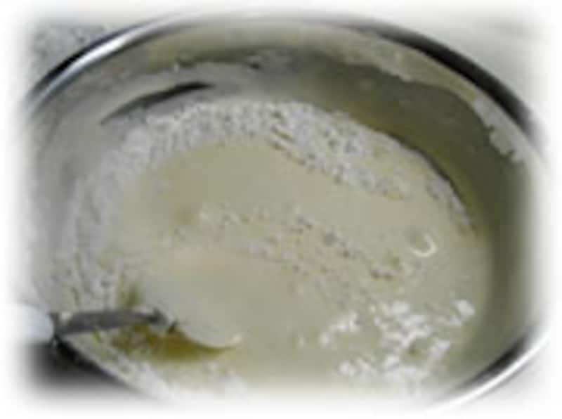 | 2・よく振るった薄力粉を少しずつ加えて、ボールの底からすくい上げるように大きく混ぜ合わせます 空気を充分に取り込み、粉のツブツブができないようによく混ぜ合わせます。 次に湯煎で溶かした牛乳とバターも加えて素早く混ぜ合わせます |
