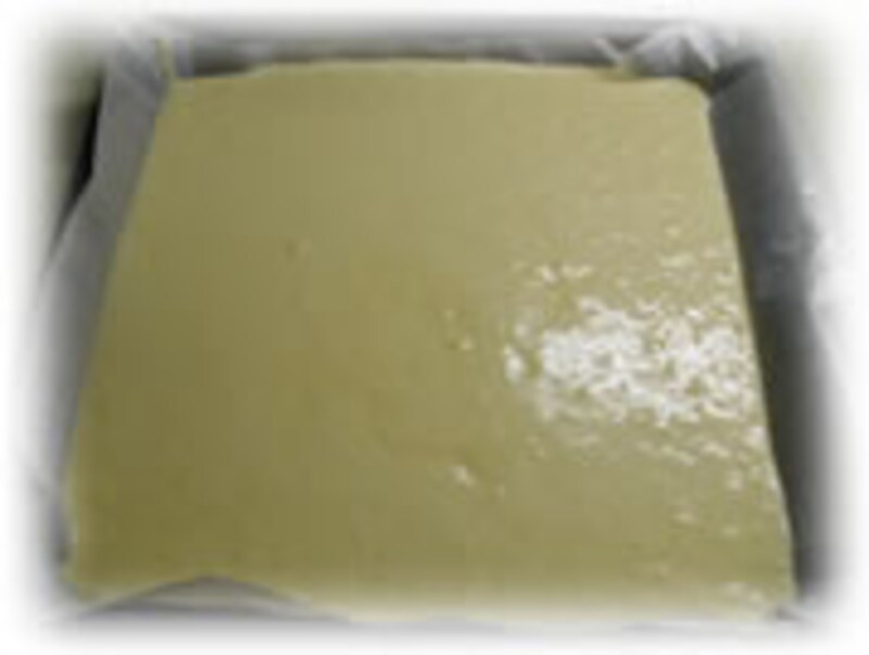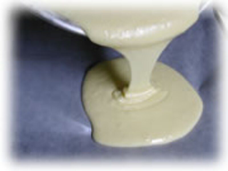 3・天板にオーブンシートを敷き、写真のような柔らかさになった生地を流し入れます 四隅まで万遍なく平らになるようにしてください |