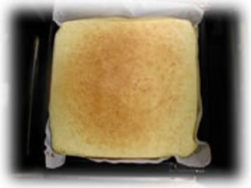 | 4・180℃に予熱したオーブンで10分くらい焼き上げます | 5・薄く焼き色がついた生地は、天板から取りだして冷ましておきます これでスポンジ生地ができ上がりです |