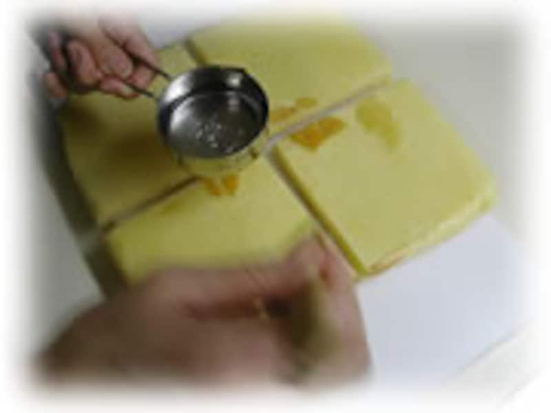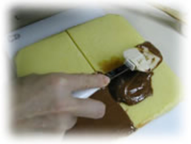 | 1・シロップは刷毛を使って、生地にたっぷりしみ込むように塗ります | 2・シロップがしみ込んだ生地にガナッシュを、3ミリくらいの厚さに均等に塗っていきます | |