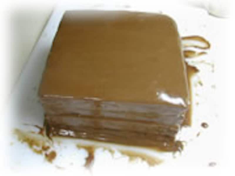 | 3・ガナッシュを塗り終えた生地を、ずれないように気をつけながら重ねていきます | 4・仕上に縁を切りおとさないときは、側面にもガナッシュを塗っておきます | |