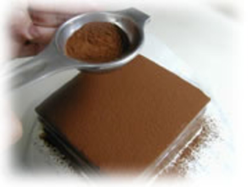| 5・充分冷めてから、ココアパウダーを振りかけます | 6・でき上がったら、冷蔵庫でよく冷やしてからお召し上がり下さいね! | |