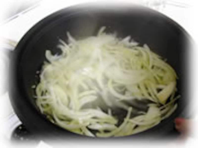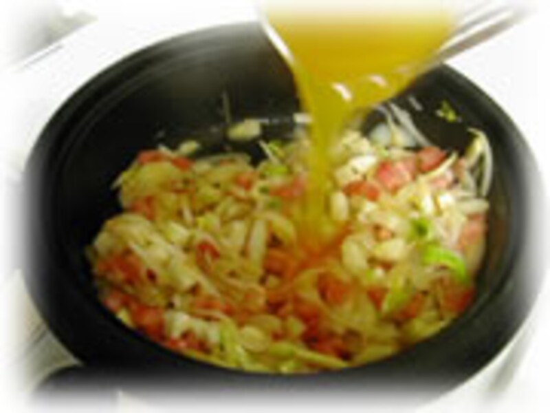 | 2・みじん切りのニンニク、玉ネギをきつね色になるまで炒めます。 | 3・トマト、ジャガイモを炒めて、軽く塩コショウしたタラをさっと炒め、ワイン・スープを加え蓋をして、弱火で20分間ほど煮ます。 | |