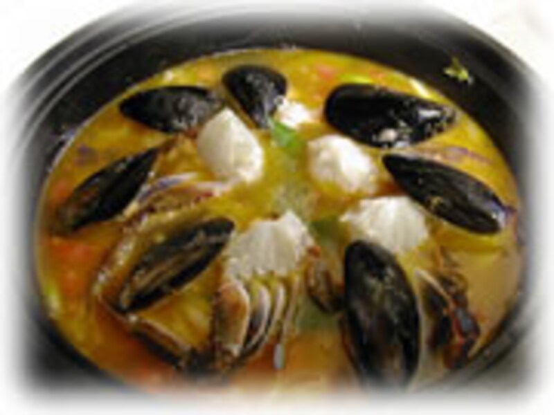 材料4人分:スカンピ又は有頭エビ4尾、生タラ切り身2切れ、ムール貝12個、ワタリガニ1匹、ジャガイモ3個、トマト大1個、玉ネギ1個、ニンニク1片、白ワイン50cc、オリーブオイル50cc、☆スープの材料;固形スープ1個、水500cc、サフランorカレー粉小サジ2、ローリエ1枚、塩、コショウ少々、パセリ |