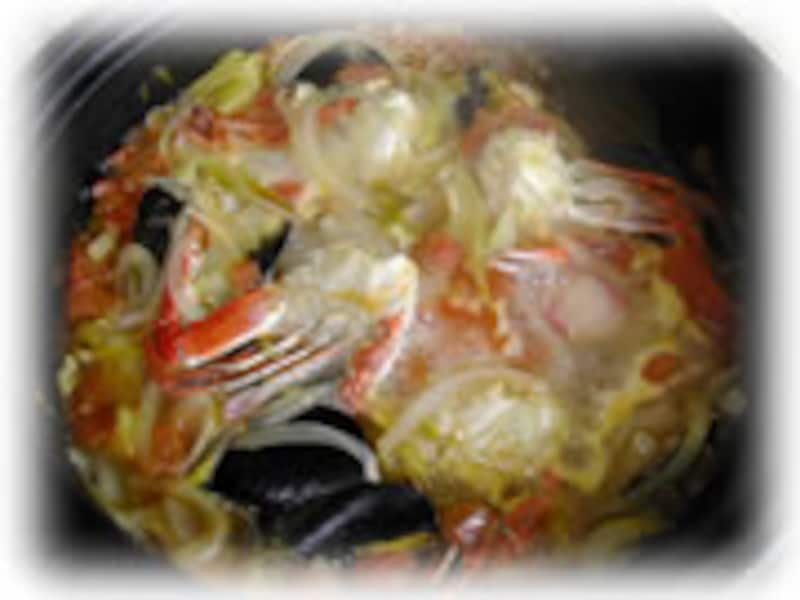 4・ムール貝、ワタリガニを加え、蓋をして弱火で10分ほど煮ます。 |