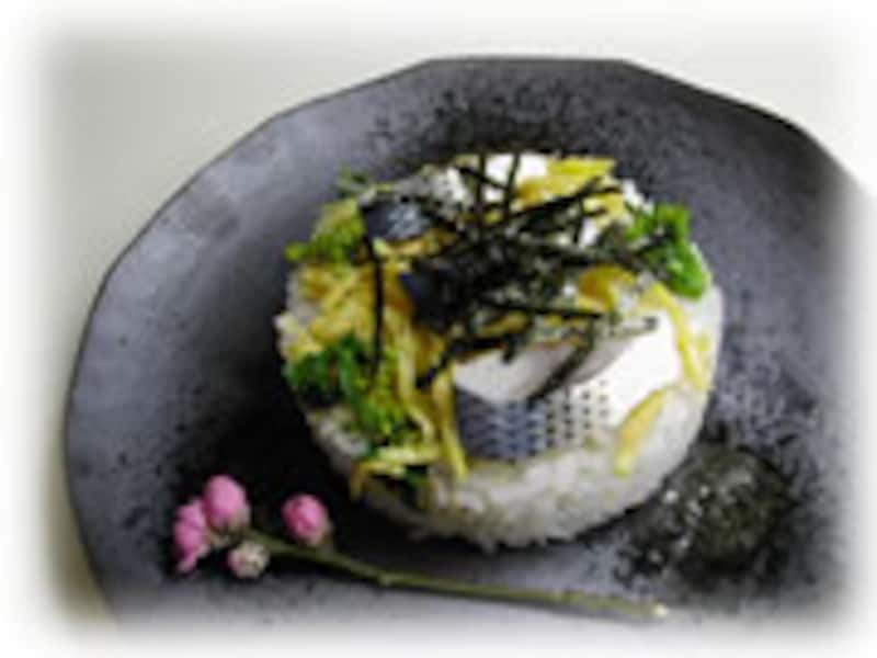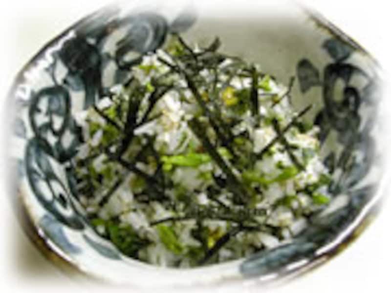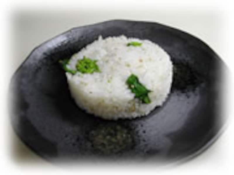 炊き上げた熱々のご飯に菜の花と炒りごま、ちりめんを混ぜ合わせ、刻み海苔を飾ります。 | |