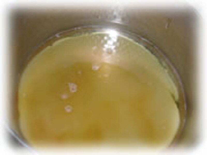 | 2・鍋に水と砂糖を入れ、良くかき混ぜてから、火にかけます。 煮詰まってきたら弱火にします。 |