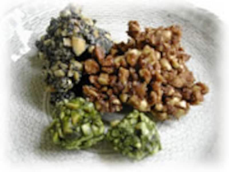 | 材料:ピーナッツ100g、三温糖80g、水60cc、適量の練り黒ごま、ブラウンシュガー、抹茶など。 | 1・ピーナッツは粗く砕いておきます。 | |