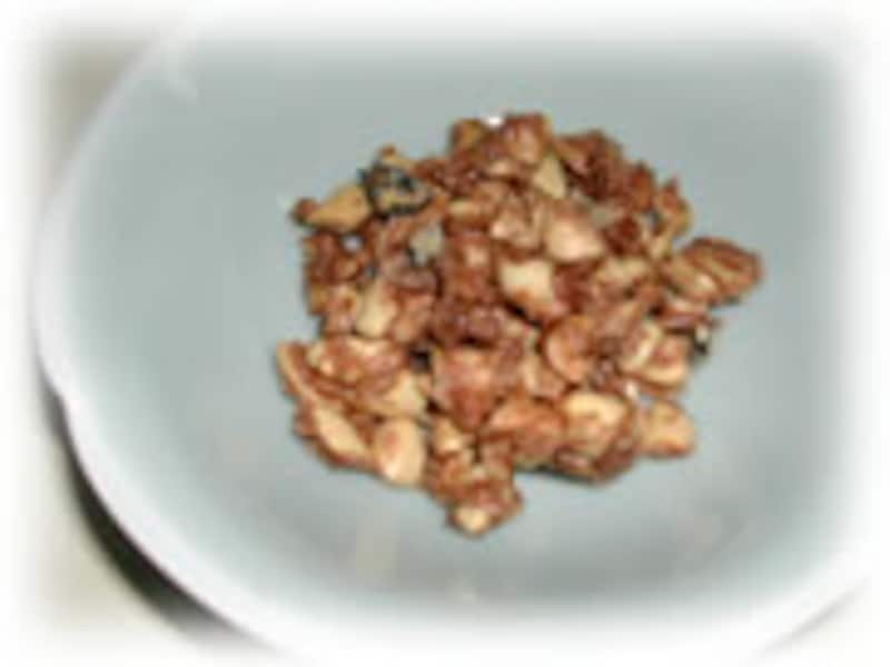 3・蜜にとろみがついたら、砕いたピーナッツを加えてかき混ぜ、火を止めます。 | |
