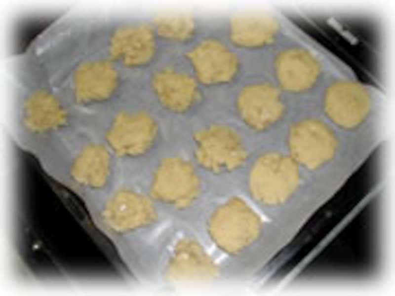 | 薄力粉、バター、砂糖、卵、バニラエッセンスを合わせたクッキー生地に、砕いたピーナッツを練り合わせ、約5cmの大きさに丸く形作り、160度に予熱しておいたオーブンで約20分間焼きます。 | ピーナッツの、つぶつぶ感がうれしいロッククッキーのでき上がりです。 | |