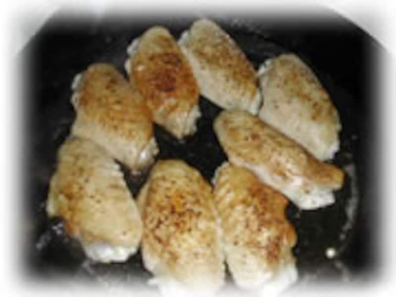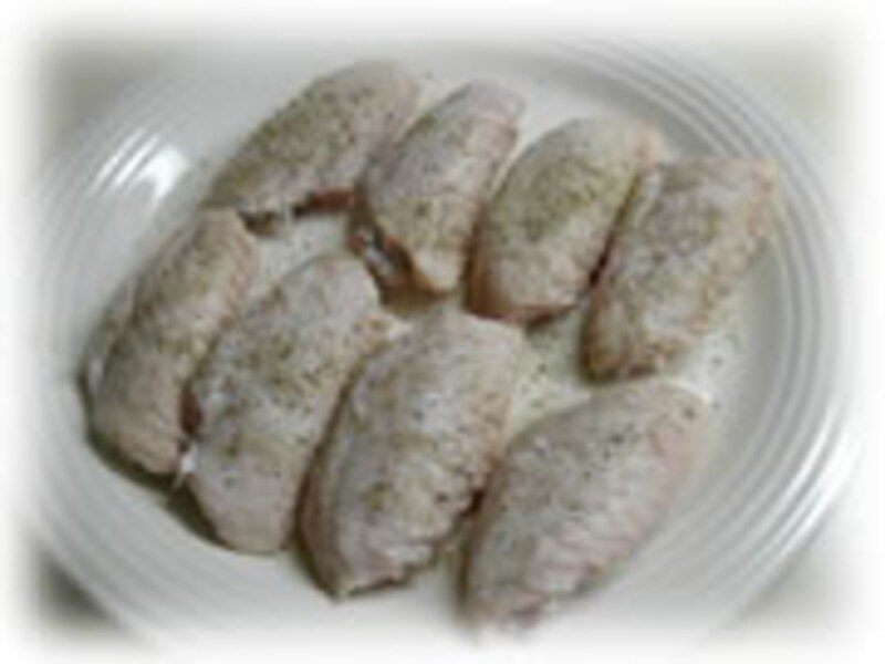 1・「手羽さき」の、先の部分を関節のところで切りはなしたものを「手羽なか」といいます。塩、コショウを振りかけておきます。 | |