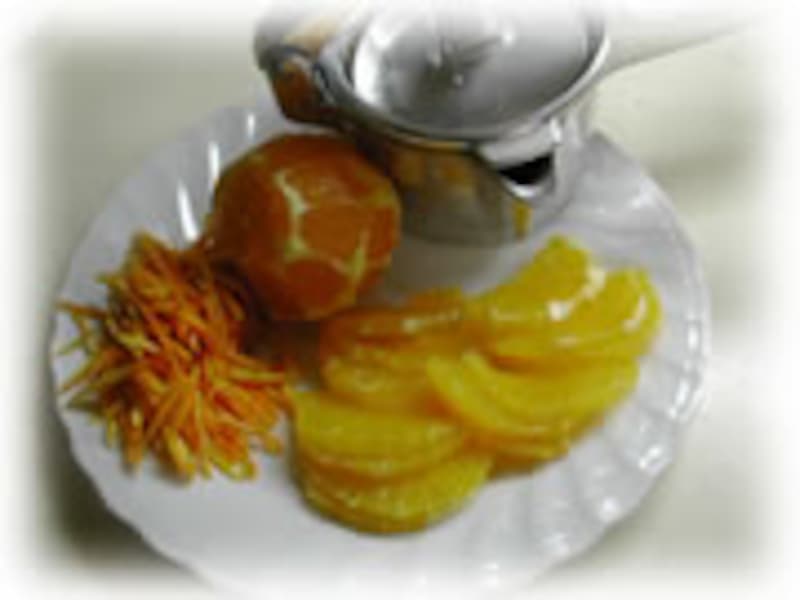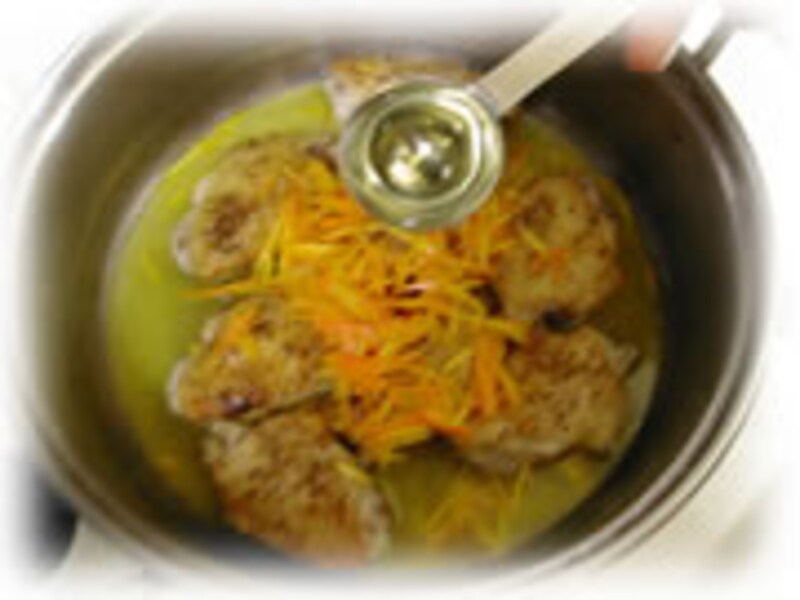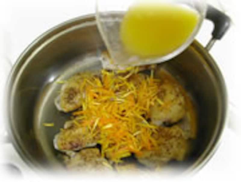 | 4・鍋に余分な油をとった手羽なかを入れ、細く切ったオレンジの皮と果汁を入れます。 | 5・中火で煮て、果汁が煮詰まってきたら火を止め、白ワインを加え、塩コショウで味をととのえます。 | |
