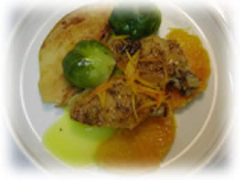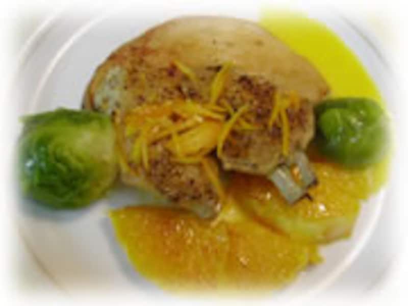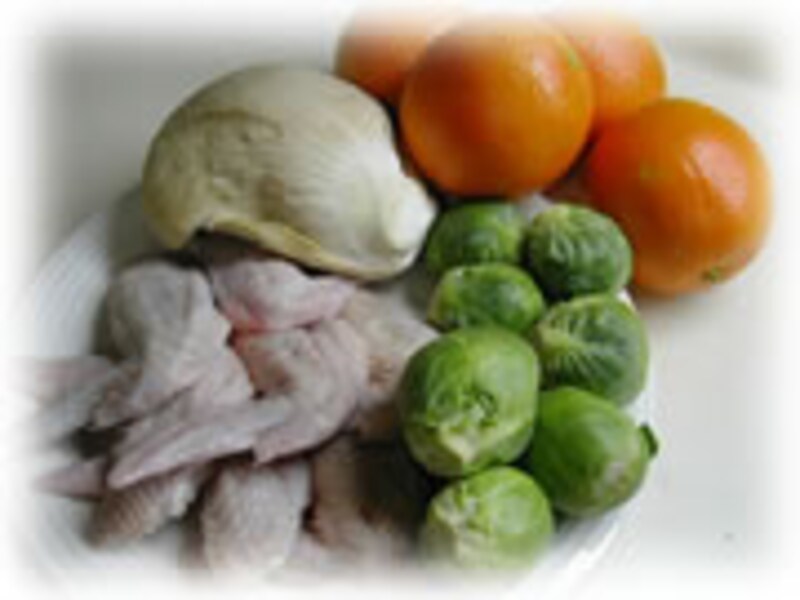 7・オレンジ、エリンギ、塩茹でした芽キャベツを飾り、手羽なかを盛り付け、上からオレンジソースをそっとかけます。 | |