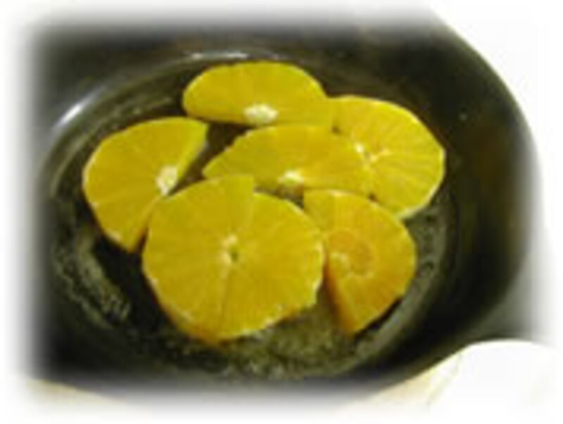 6・飾り用のオレンジ、薄く切ったエリンギは、バター(大さじ1)で軽くソテーします。 |