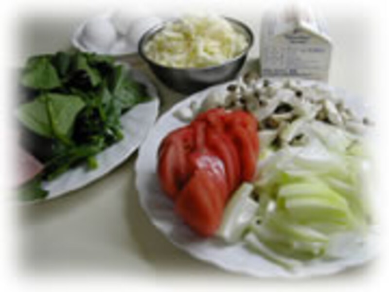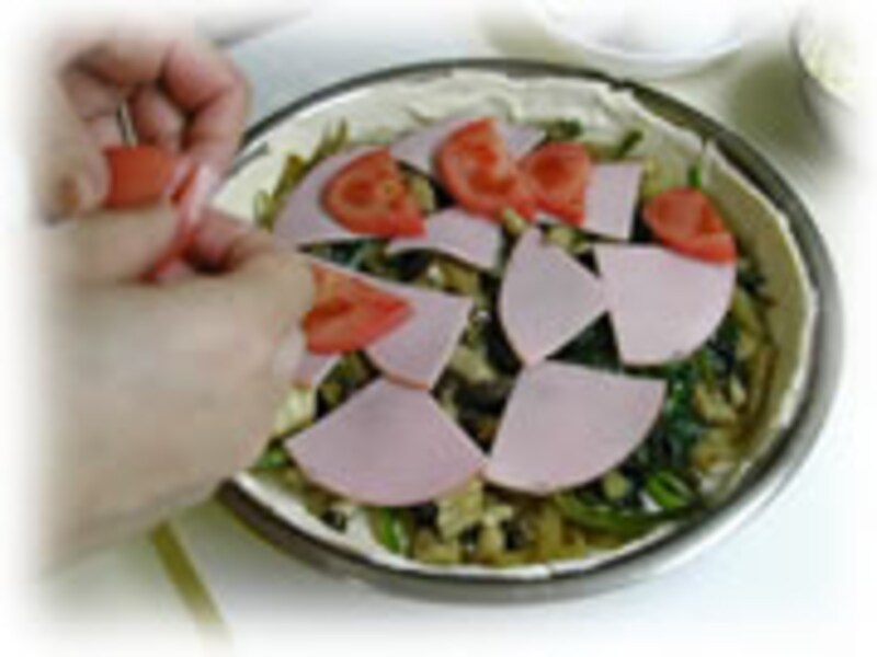 | 2・野菜類は適当な大きさに切り、熱したフライパンに、まずたまねぎを炒め、しめじ、ほうれん草の順に、炒め合わせます。塩コショウで味をととのえます。 | 3・パイシートの上に炒めた野菜をのせ、ハム、トマトを順に飾ります。 | |