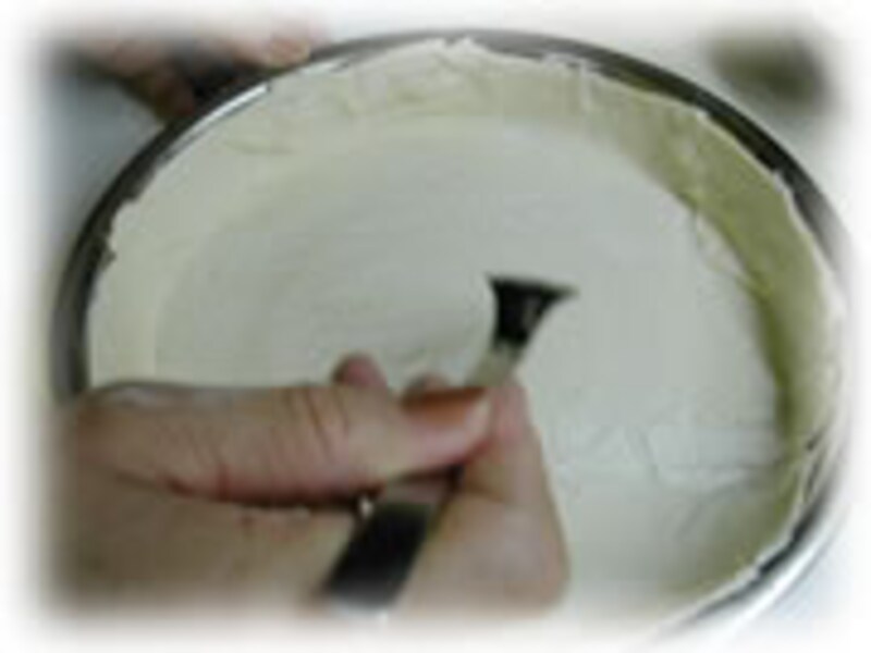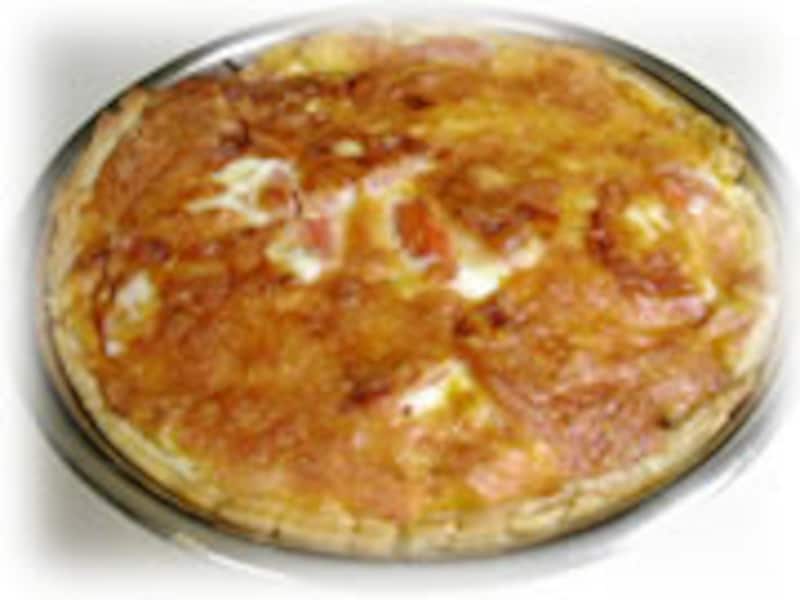 | ☆23cm径のキッシュの材料:冷凍パイシート1枚、トマト中1個、たまねぎ1/2個、しめじ80g、ほうれん草80g、ハム4枚、卵3個、生クリーム80cc、ピザ用チーズ150g、塩コショウ、少々、サラダ油大さじ1。 | 1・冷凍パイシートを30cm角の大きさに伸ばし、縁を立ち上げるように23cmのオーブン皿に張り付けます。火の通りを良くするために底面をフォークで穴をあけておきます。 | |