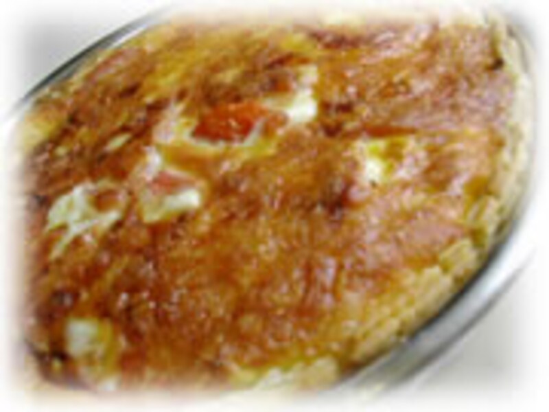| ☆23cm径のキッシュの材料:冷凍パイシート1枚、トマト中1個、たまねぎ1/2個、しめじ80g、ほうれん草80g、ハム4枚、卵3個、生クリーム80cc、ピザ用チーズ150g、塩コショウ、少々、サラダ油大さじ1。 | 1・冷凍パイシートを30cm角の大きさに伸ばし、縁を立ち上げるように23cmのオーブン皿に張り付けます。火の通りを良くするために底面をフォークで穴をあけておきます。 | |