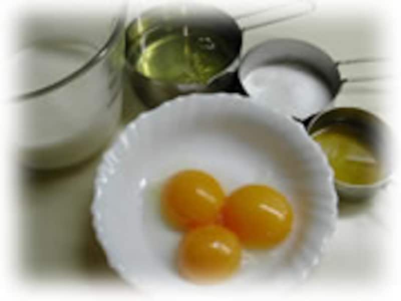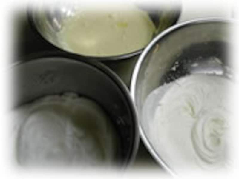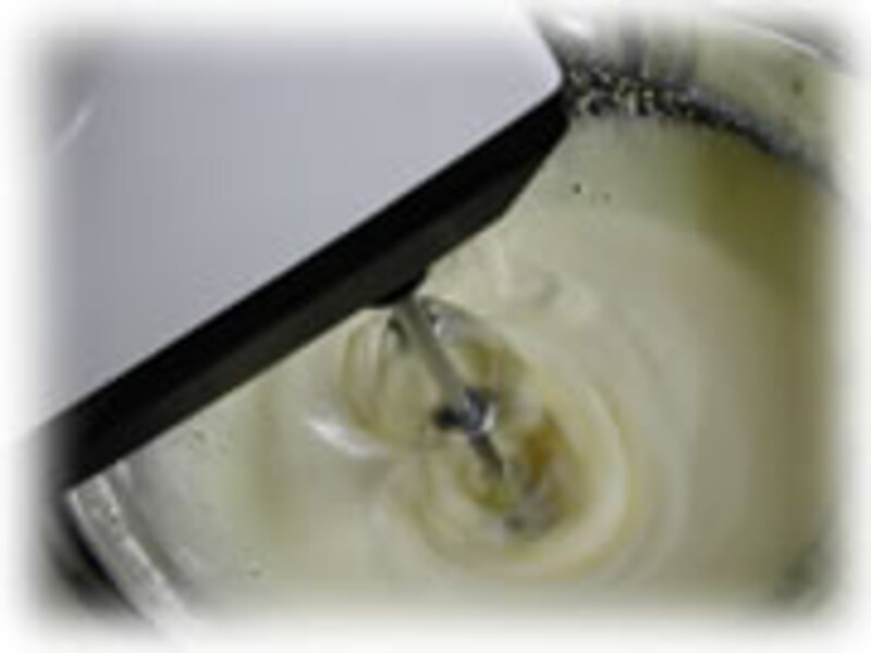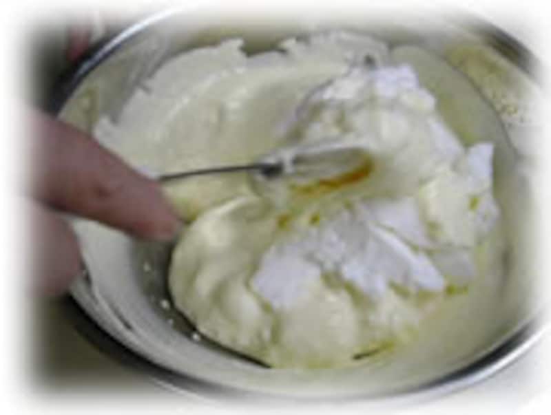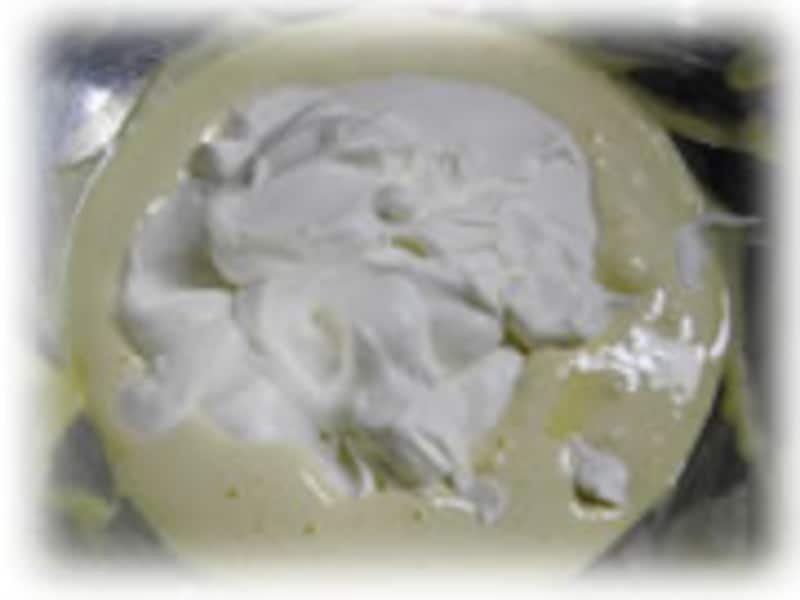 | 2・卵白に小さじ1の砂糖を加えて、十分泡立ててメレンゲをつくります。 次に生クリームもボールに入れて泡立てます。 卵黄、卵白、生クリームとすべてを別々のボールに泡立てます。 | 3・卵黄を泡立てたボールに、泡立てた生クリームを加えて合わせます。 | |