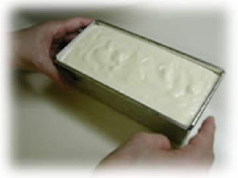 | 4・最後に、メレンゲを2回に分けて、さっくり切るように合わせこれでセミフレッドの準備完了です。 | 5・容器に流し入れ、トントンとして均一にし、上にラップをかぶせて冷凍庫で一晩冷やし固めます。 | |