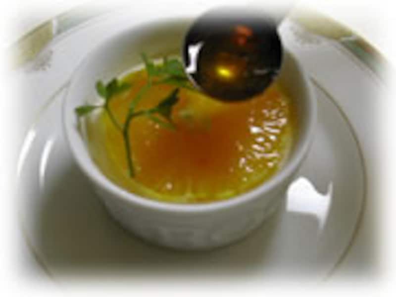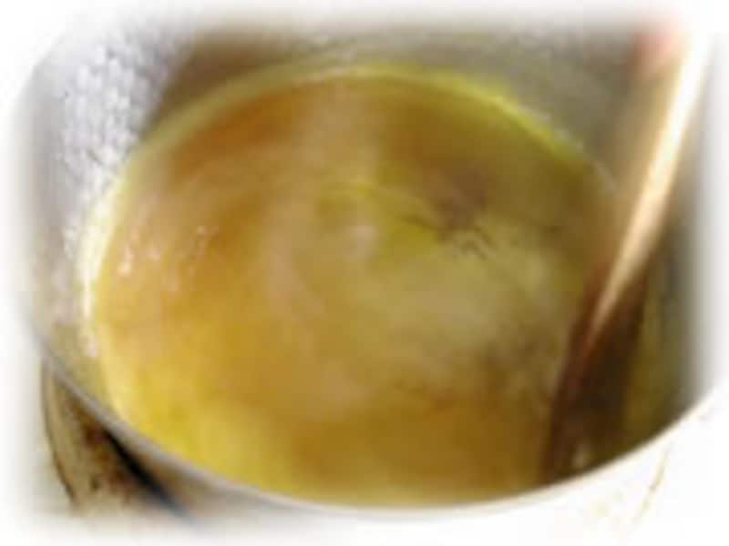 | ☆オレンジコンポートの材料:オレンジ3個(1個は絞って果汁に、2個は12枚にスライスします)グラニュー糖200g、すり下ろしたオレンジの皮を少々、クワントロ小さじ1、水70cc。 | 1・グラニュー糖と水を鍋に入れ、中火にかけてゆるめのキャラメルソースをつくります。オレンジ1個分のジュース、クワントロ、すり下ろした皮も加え、火を止めます。 | |