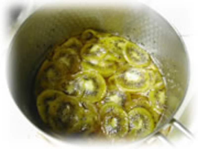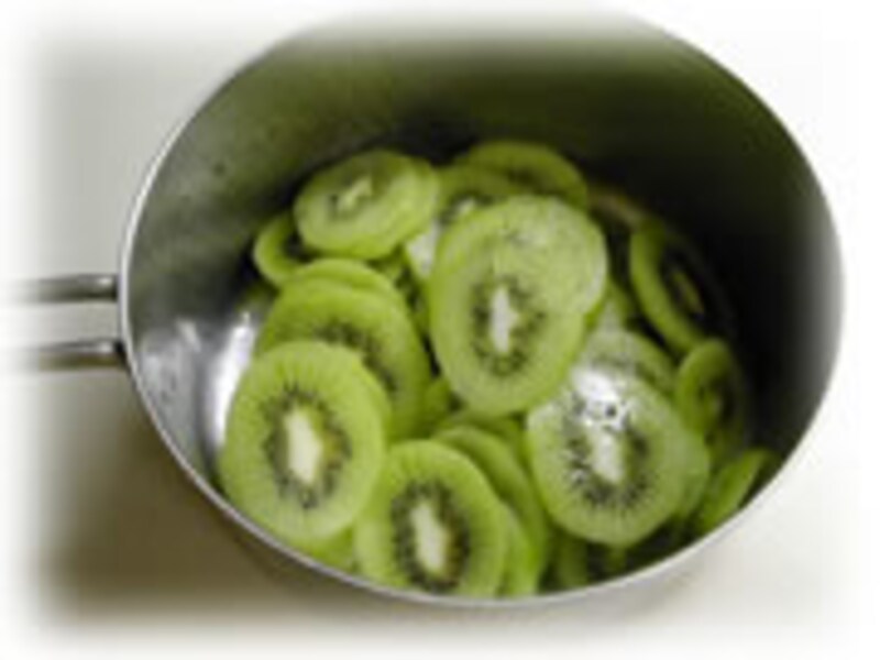 | 材料:キウイ450g、砂糖150g、白ワイン50cc。 | 1・キウイは皮をむき約5mmの輪切りにします。 | |