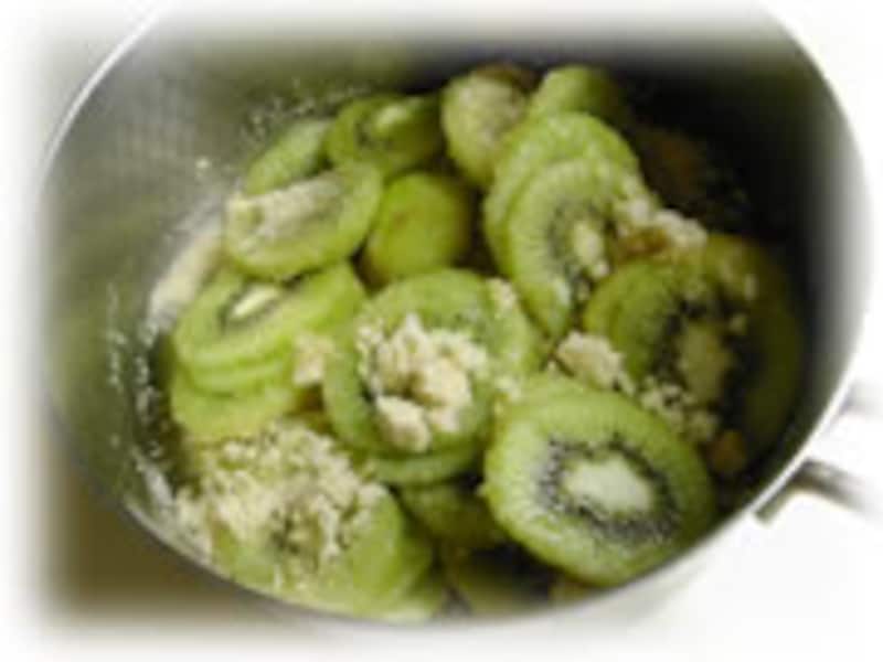 | 2・ホーロー鍋やステンレス鍋にキウイを入れ、砂糖を振りかけて、1時間程おいておきます。 | 3・キウイから水分が出てきます。白ワインも加えて中火で焦がさないように煮詰めていきます。とろみがついたらでき上がりです。 | |