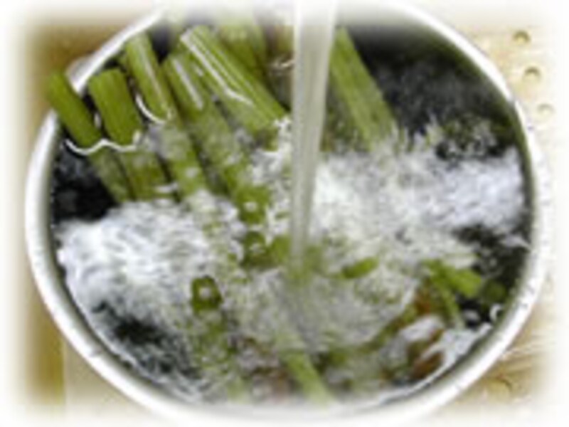 | フキの下ごしらえ:フキを茹でる鍋の大きさに切り、たっぷりの塩で板ずりをします。 | 煮立ったお湯で茹で、しんなりしたらすぐに流水で冷ましてから皮をむきます。 | |
