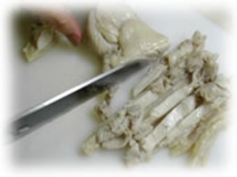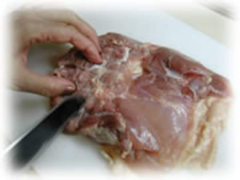 | 2・蒸し器に湯気が上がってきたら、肉を入れ、中火で8分間蒸します。取り出した後、粗熱を取り冷蔵庫で冷まします。 | 3・鶏肉は5ミリの厚さにそぎ切りします。 | |