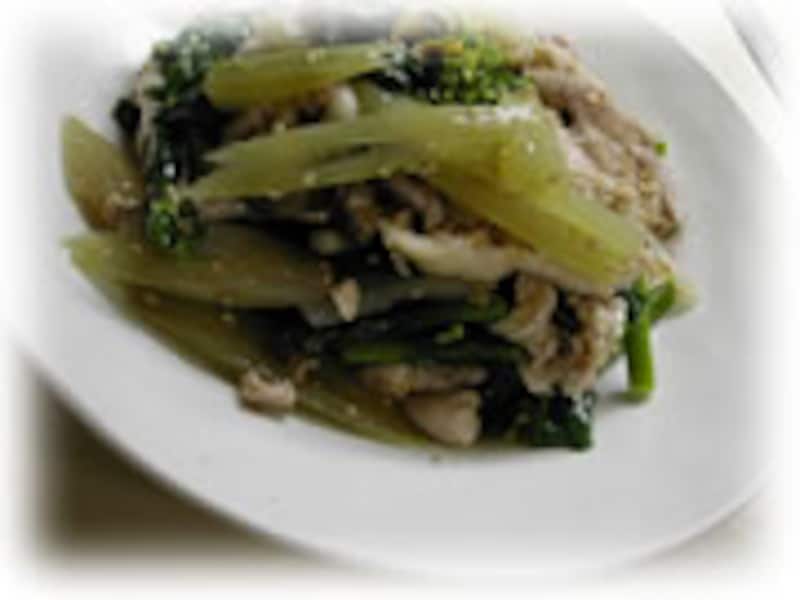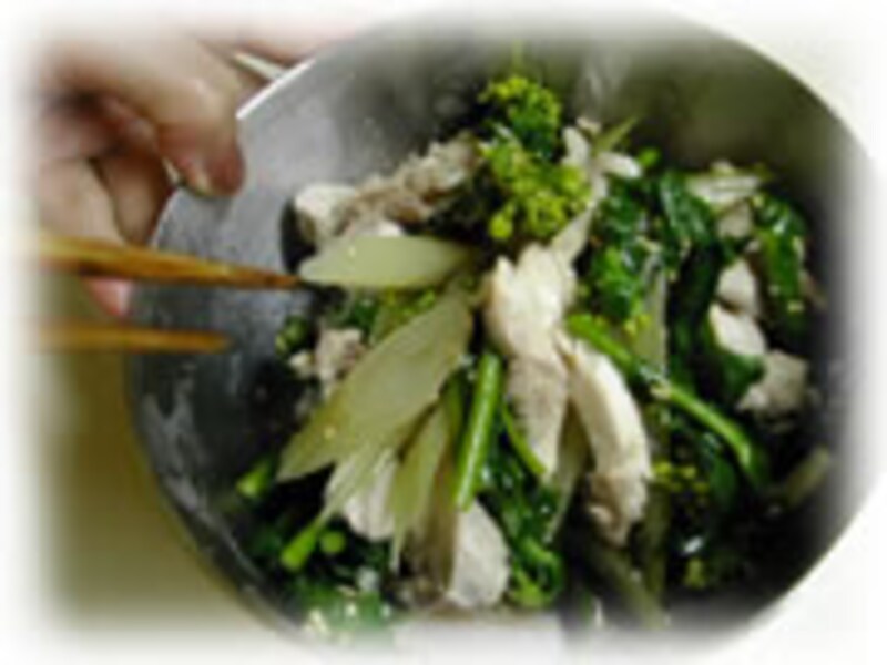まずは、フキと菜の花、そして鶏の酒蒸を中華風ソースで和えてみました。 |
