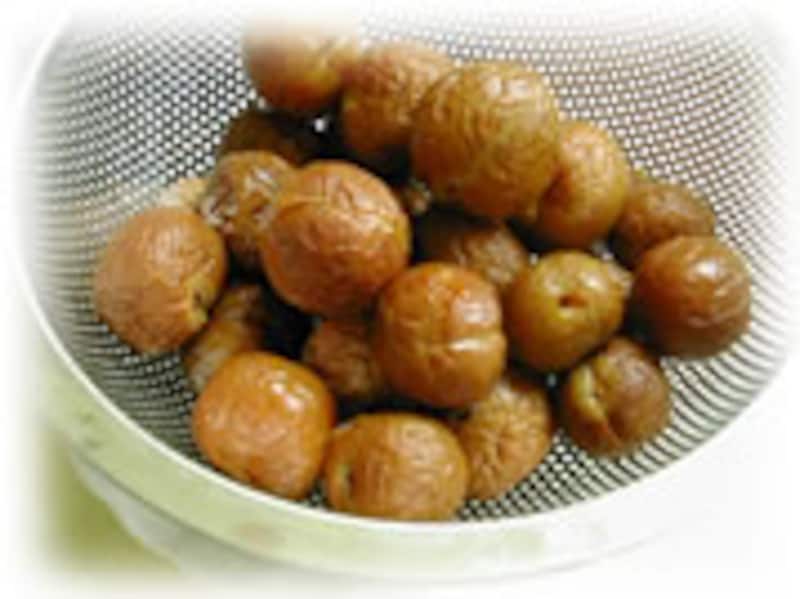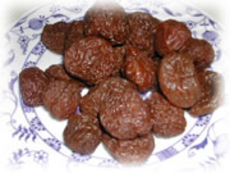 | 材料:乾燥梅200g、三温糖100g、白ワイン大サジ2、レモン1/2個。 | 1・乾燥梅は綺麗に洗い、一晩、水を時々変えて浸けておきます。充分に柔らかくなった梅はザルにあげ、水気をよく切っておきます。 | |
