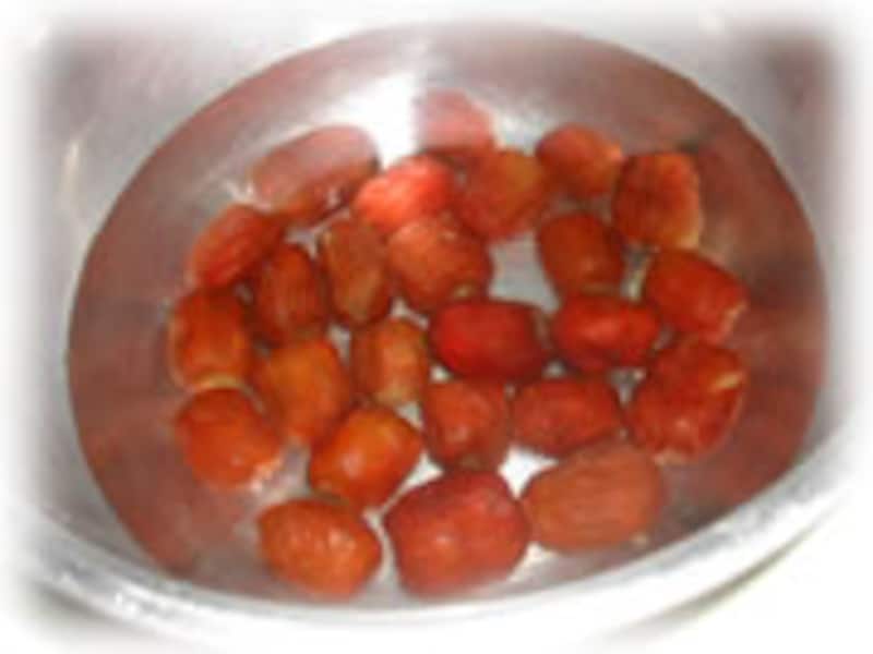 | 材料:乾燥ナツメ150g、三温糖70g,白ワイン大サジ2、レモン1/2個。 | 1・乾燥ナツメは時々水を替え、一晩浸けて柔らかくしておきます。 柔らかくなったらザルに揚げ水気をよく切っておきます。 |