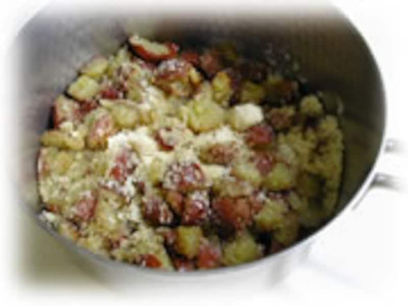 | 2・梅を細かく切って砂糖をまぶし、1時間ほど置いておきます。 | 3・砂糖がしみ込んだ梅に白ワインを加え、中火で煮立ってきたら、弱火にして30分間煮つめます。レモン汁をふりかけ、火を止めます。 | |