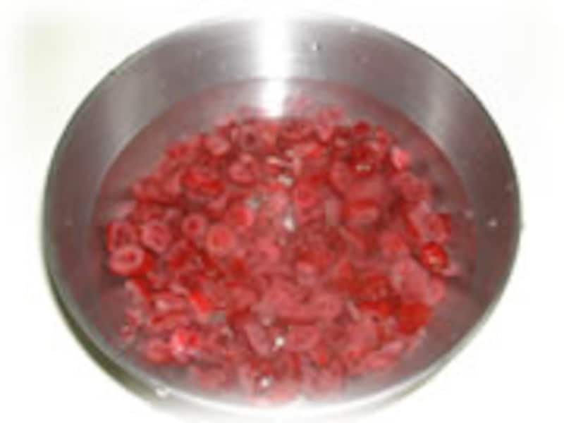 | 乾燥クランベリー100g、三温糖50g、レモン1/2個、白ワイン大サジ3。 | 1・ぬるま湯で綺麗に洗い、ときどき水を替えて一晩ほど浸けておきます。 | |