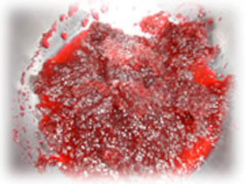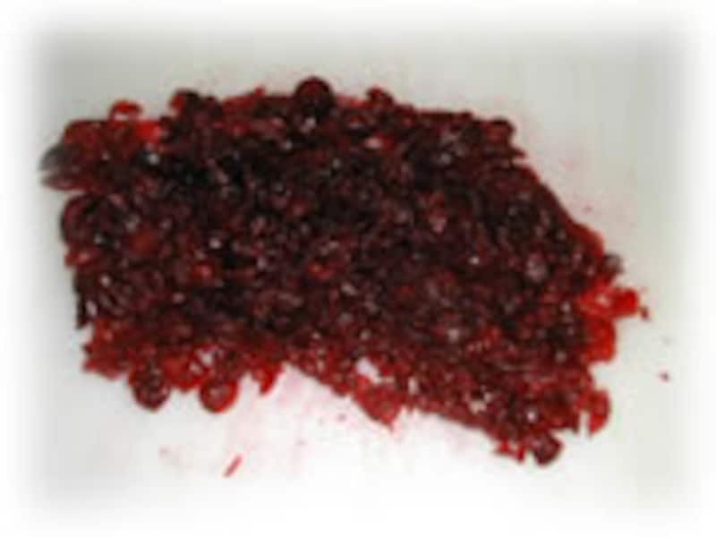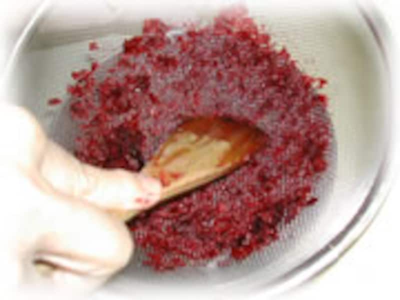 | 4・クランベリーは皮が硬いので、口当たりを滑らかにするのに、裏ごしをします。 | 5・柔らかい酸味が嬉しいクランベリージャムのでき上がりです♪ | |